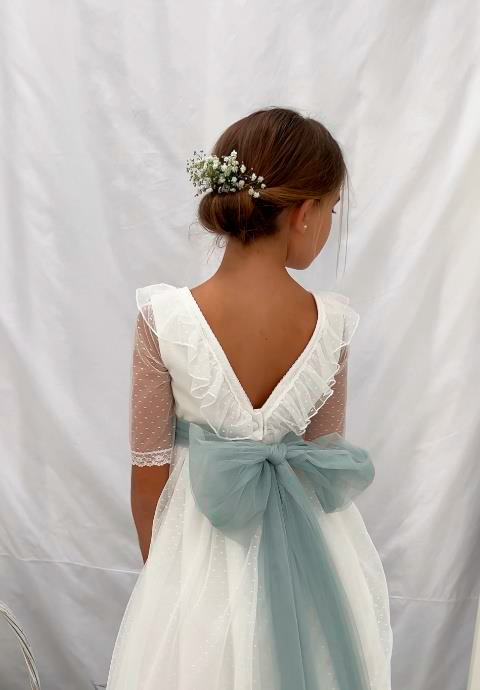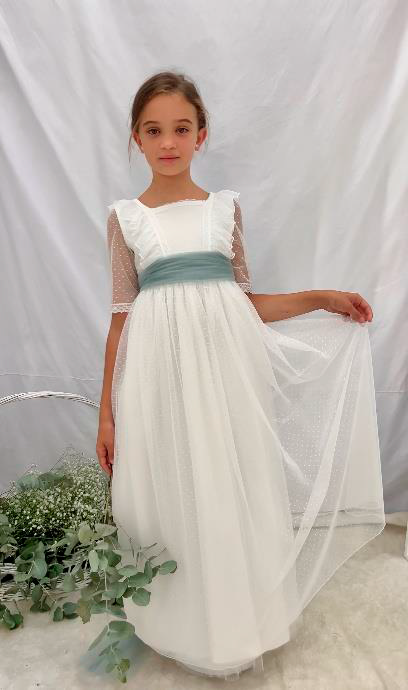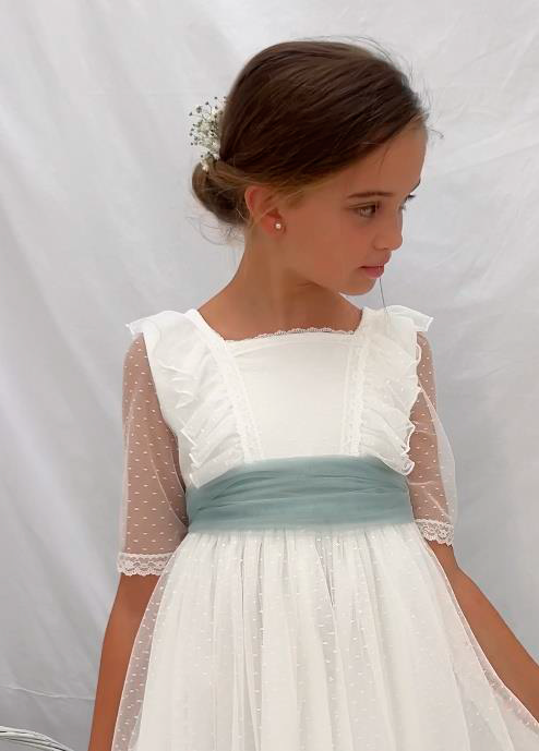 - Vestido con cuerpo y falda en tul de plumeti blanco roto.