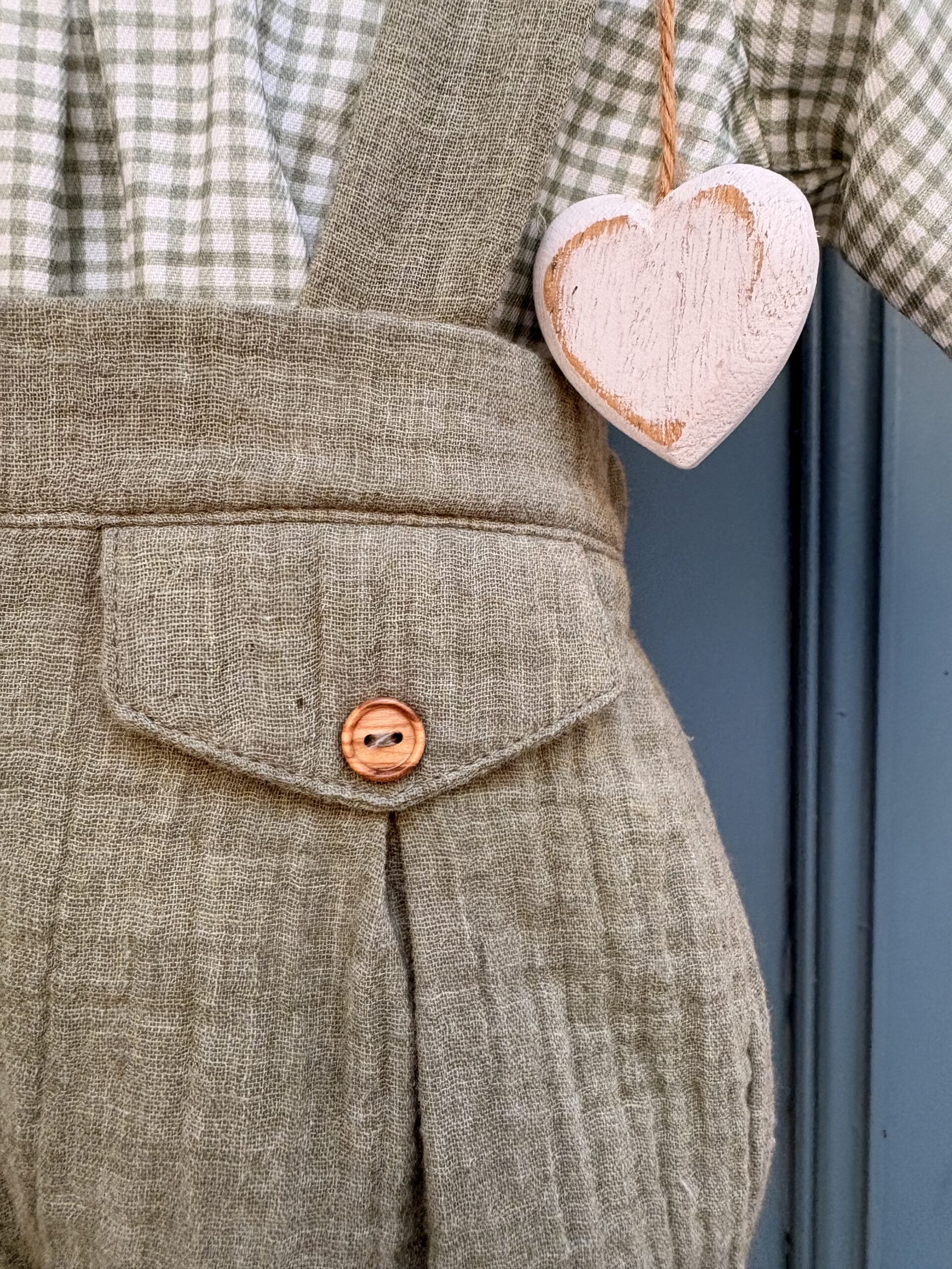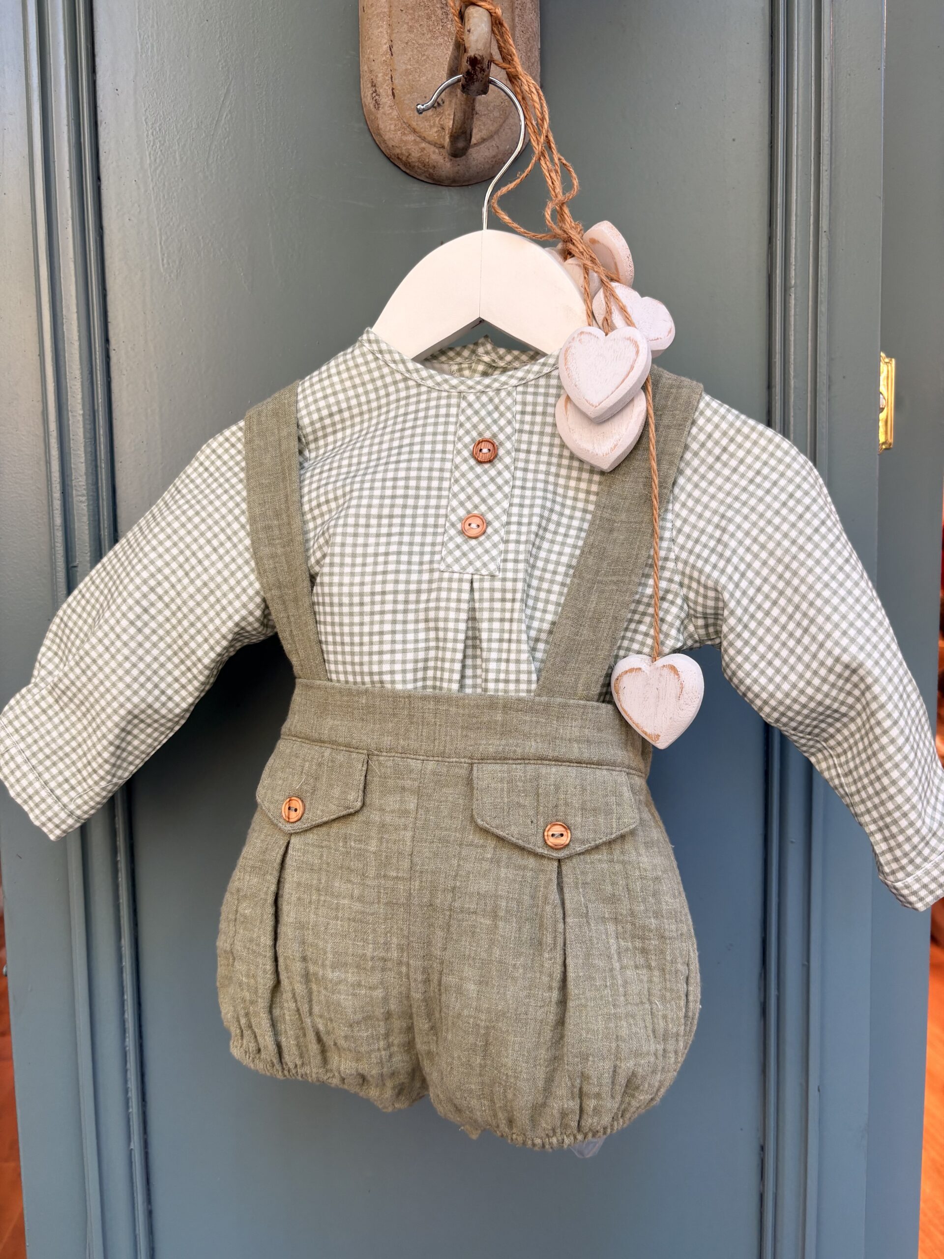 Camisa cuello a la caja en vichy en verde seco y pantalón ranita con goma de bambula