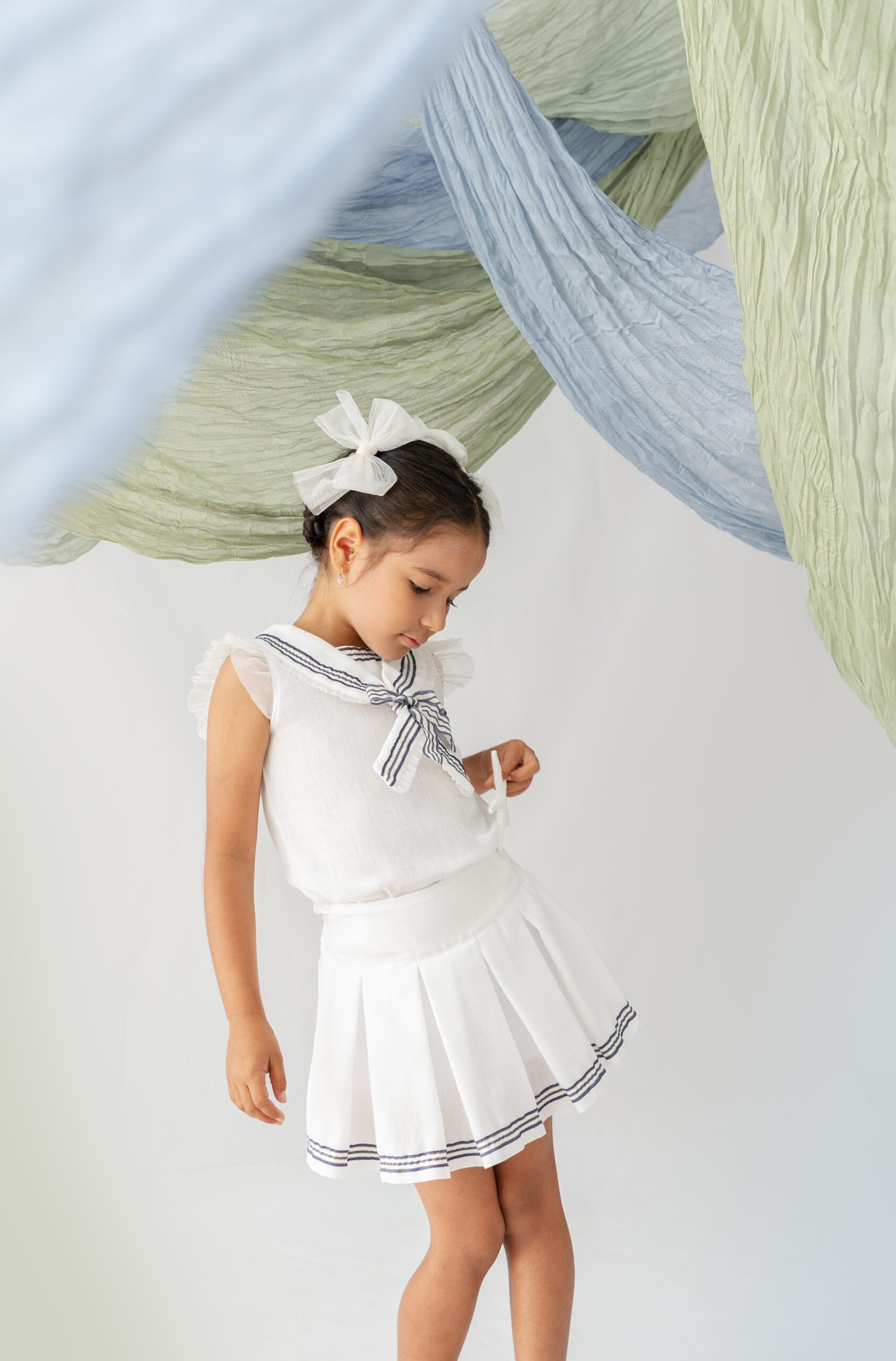 Conjunto de niña de manga corta blanco con detalles en azul marino de la colección SIROKO.