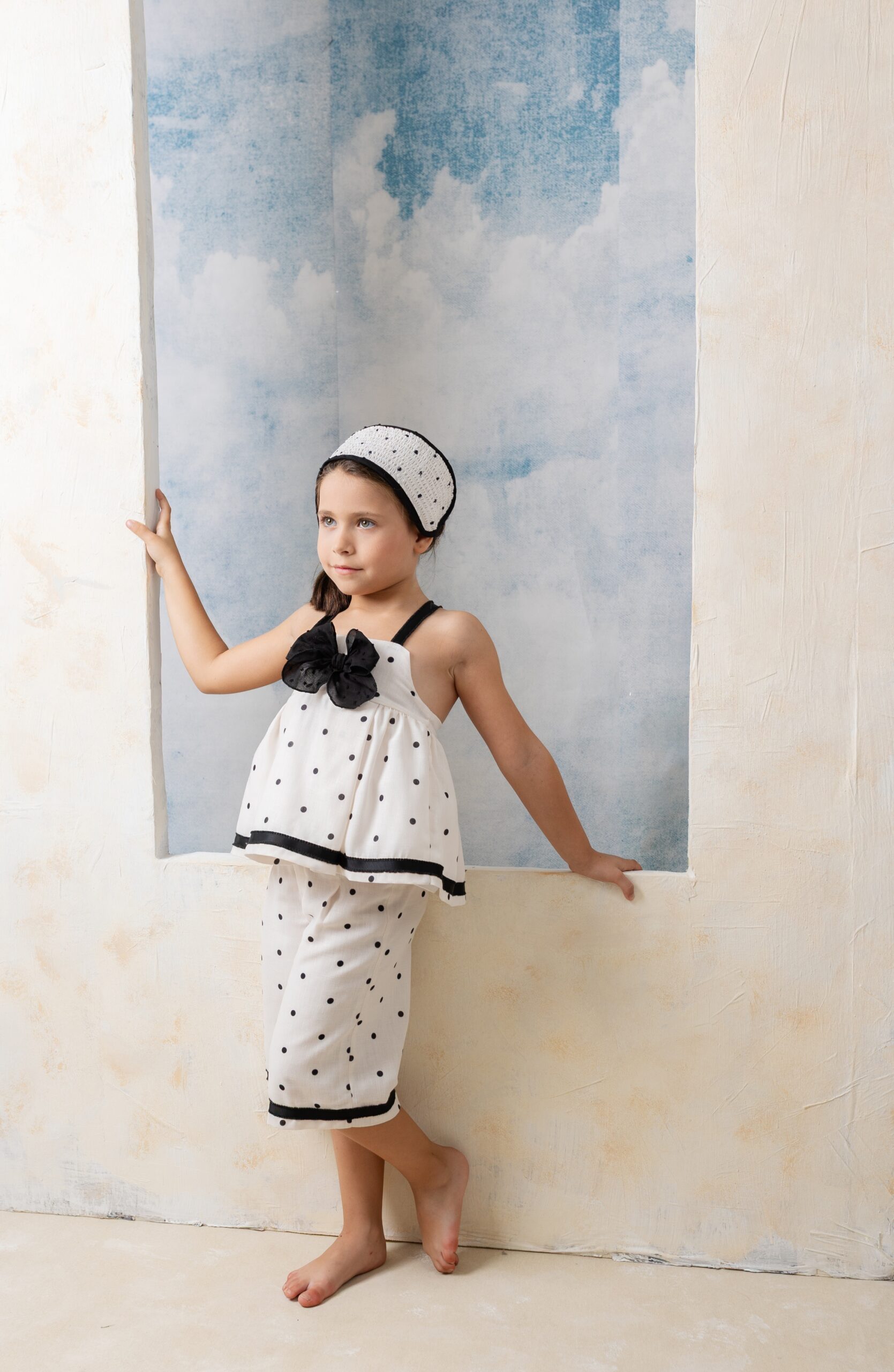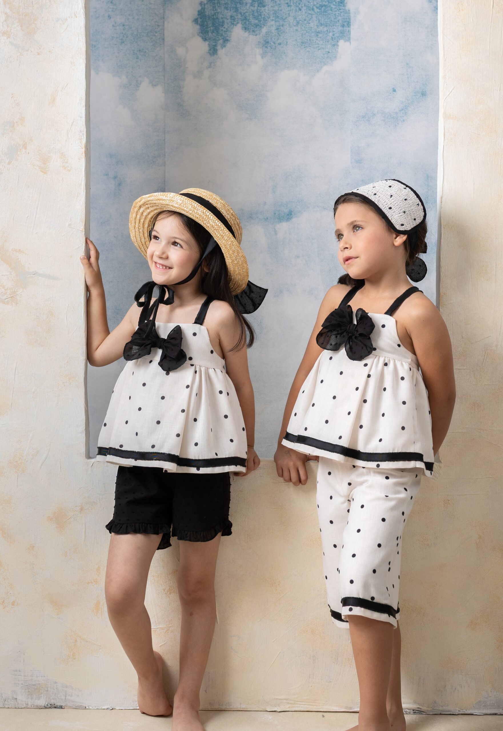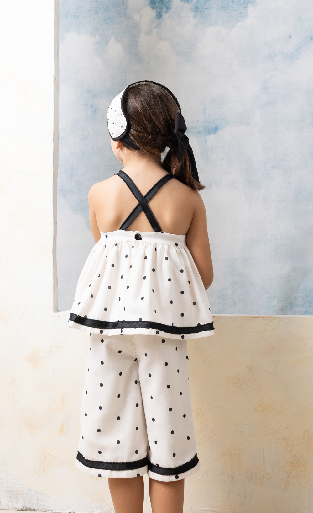 Conjunto de niña estampado de lunares blusón y falda con lazo y detalles en negro.
